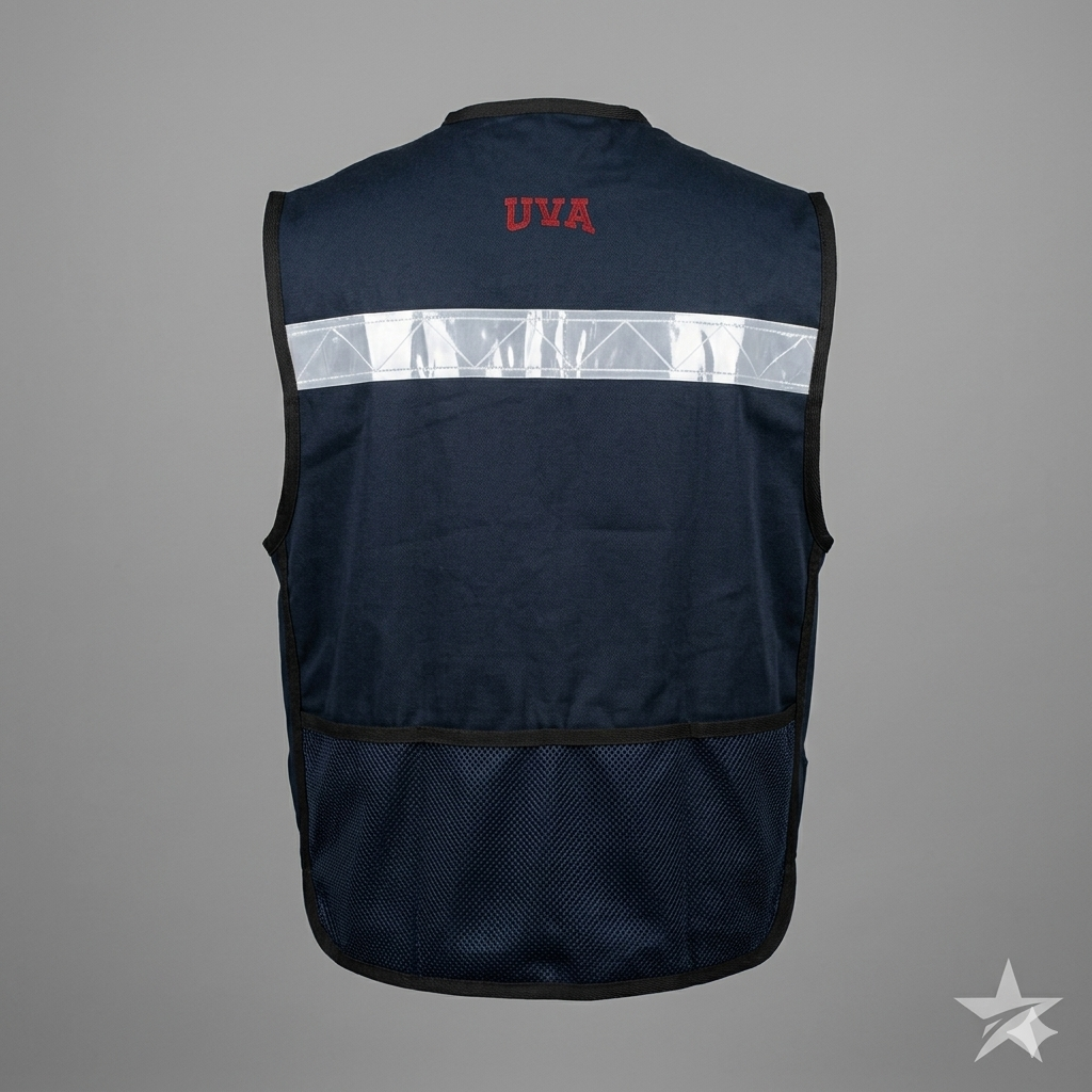 Elaborado en tela resistente color azul marino, cuenta con franjas reflejantes al frente y en la parte posterior para mayor visibilidad. Incluye múltiples bolsillos funcionales ideales para portar herramientas pequeñas, libreta o accesorios de trabajo.